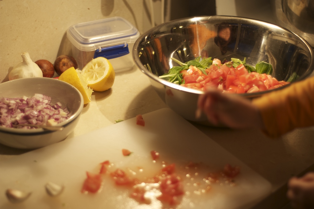 Persze kapott egy kis kiegészítést, sok paradicsomot, egy fej citromba áztatott és besózott lilahagymát apróra vágva, pár gerezd fokhagymát, olívaolajat, rozmaringot és őrölt koriandert, sót, fehérborsot, egy evőkanál balzsamecetet és egy fél citrom levét. A gyerekkel készítettük, apa vágta fel a cuccot, a gyerek meg állt a széken és küldte be a bödönbe amit apa felvágott. Utána jól összekevertem (nem a gyereket) és félretettük (nem a gyereket), hogy összepihenjenek az alkotórészek.