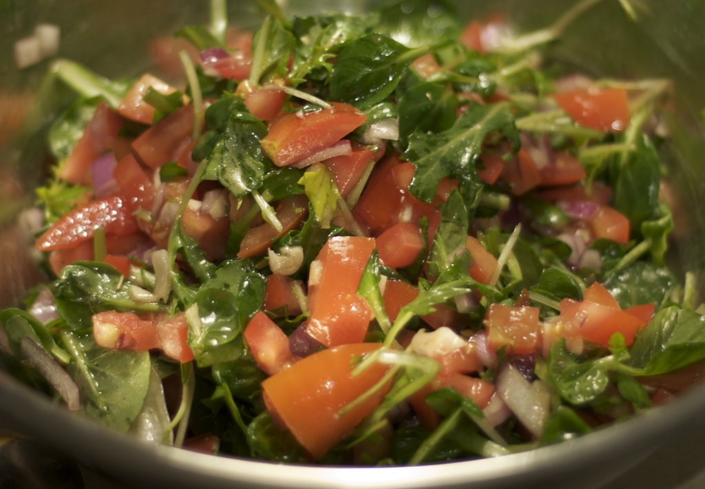 Valami vacsit kellett adni a családnak, úgyhogy körülszimatoltam miből lehetne varázsolni valamit. Leltem a frigóban még egy adag salátánakvalót, amiből a múltkori nagyon finom salit is csináltam. Ez ilyen zöld levelek, amelyeknek csak olaszul van nevük (rukkola meg pikkula vagy mi a rosseb), sőt, egyre erősebb meggyőződésem, hogy az ilyen salátaizék megjelenése határozott összefüggésben van a tavasszal egyre erősődő, kiwi fűnyírási fixációval. Tényleg úgy is néz ki, mintha a fűnyíró dobozából, vagy az árokparti kaszálás utáni maradékból lenne. De finom.