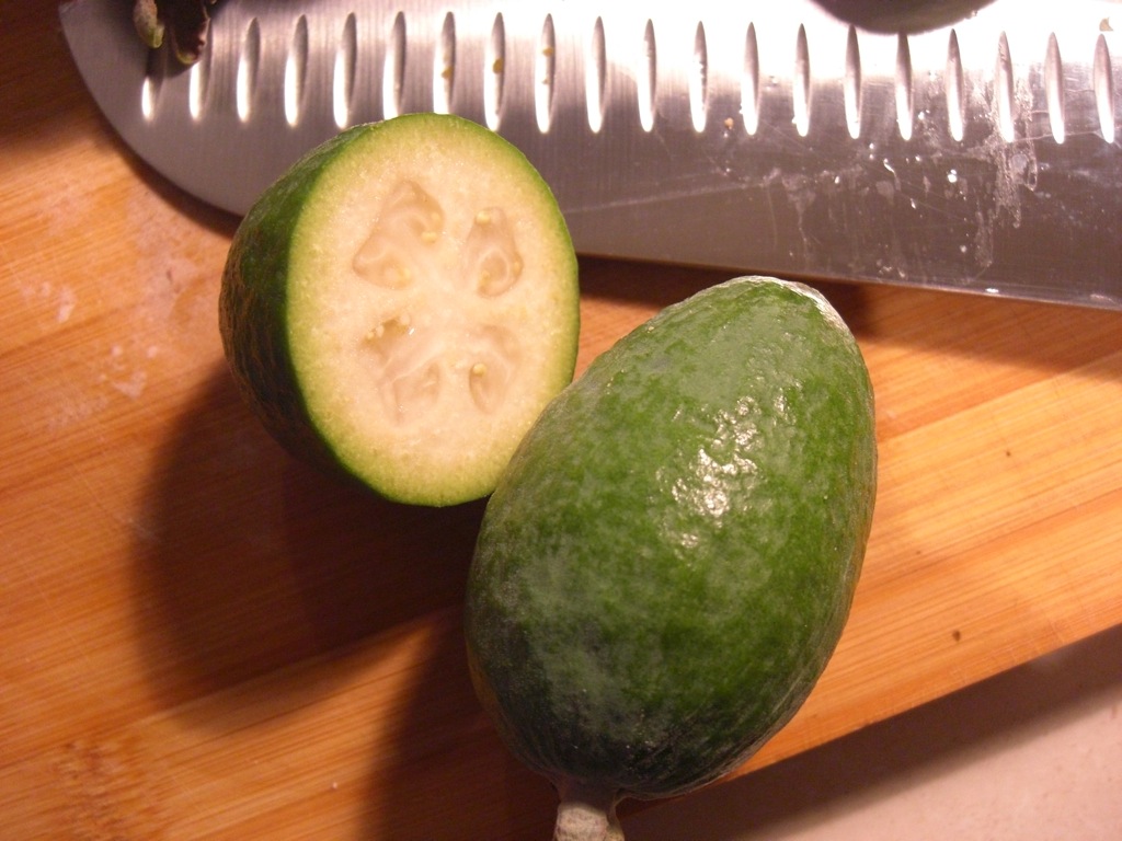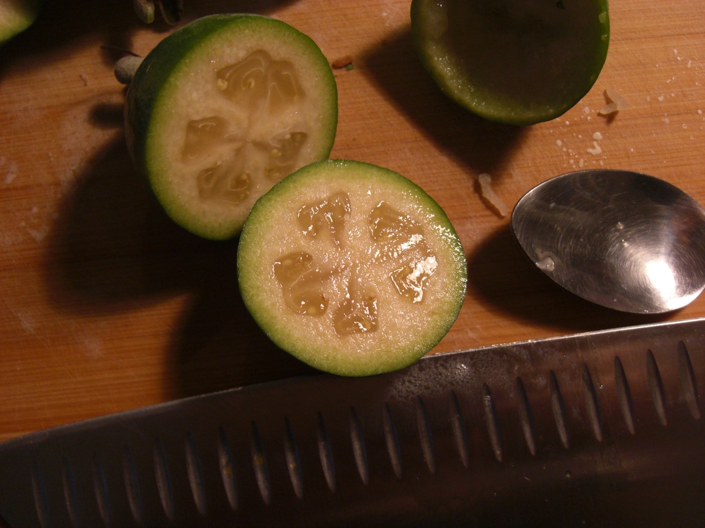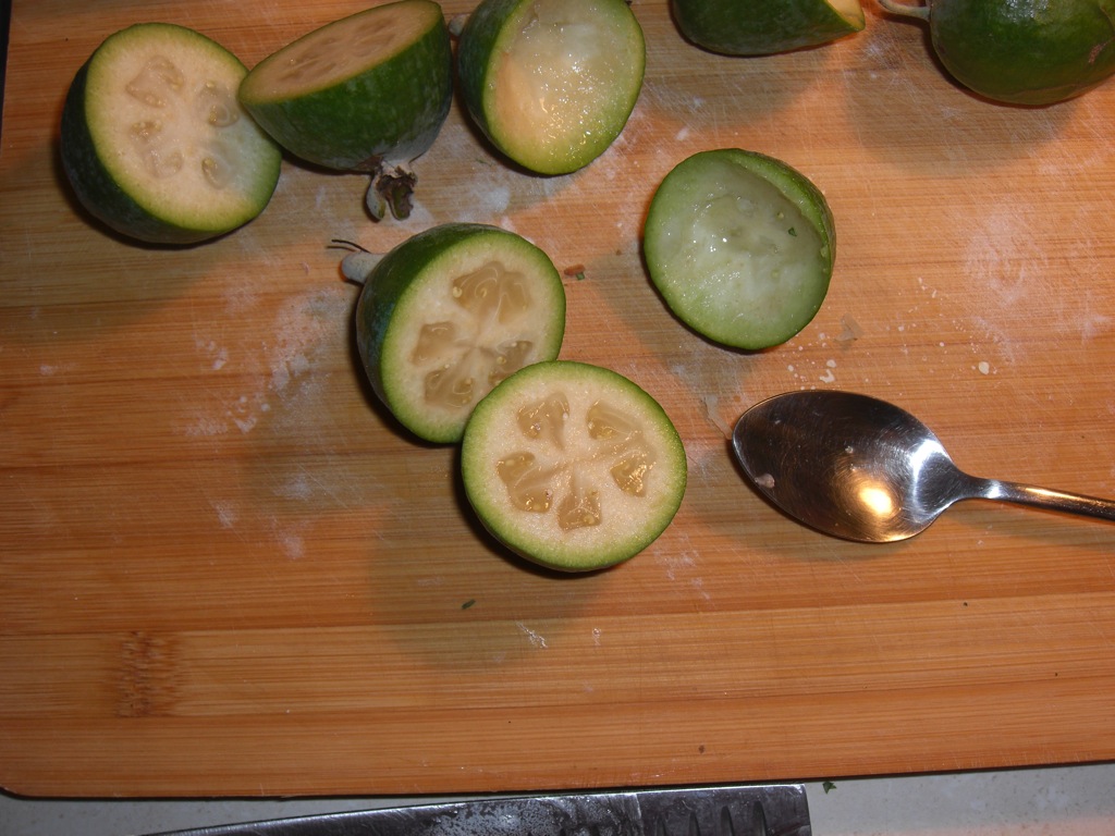A feijoa (ejtsd: fídzsoa) roppant hálás növény, én konkrétan egyáltalán nem törődöm vele, csak nő. Se nem locsolom, se nem babrálom, csak amikor már elkezdenek leesni a gyümölcsök, akkor szedek a fáról frisset. Ha félbevágjuk, akkor kanállal ki lehet zabálni a bélését, meglehetősen különleges íze van, semmihez sem hasonlít. Majd főzök belőle lekvárt.Meg lehet vele sütit csinálni. Meg fagyiba tenni. De nyersen a legjobb, finom, cukrozott gabifogkrém íze van.