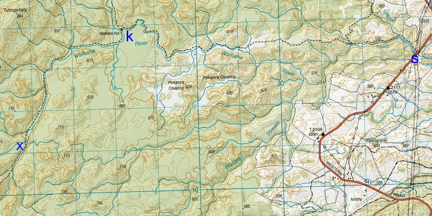 Egyszer csak egy tisztáson találtam magam, ahol vidáman kvaterkázott a másik kettő, mintha csak a kocsmába ugrottak volna le, úgyhogy lecuccoltam én is. Nem sokkal később kicsit magamhoz tértem, úgyhogy csatlakoztam a szorgoskodókhoz, csináltunk egy csinos flycamp-et, raktunk tüzet, megkerestük a vízvételezős helyet, meg egyáltalán, kényelmesre belaktuk a tisztást. (lejjebb a térképen s:az ösvény eleje, k:kunyhó, x: táborhely. A térkép Topo50) Vacsira rehidráltuk a csilit, főztünk hozzá rizst, kedélyesen belakmároztunk, és kis borozgatás után elhúztunk aludni. Másnap én képtelen voltam a végtagjaimat az eredeti rendeltetésüknek megfelelően használni, úgyhogy reggeli után, amikor a srácok elkocogtak vadászni én visszafeküdtem és pihentem és azon gondolkodtam, hogy a kocsiban még nevetségesnek tűnő helitranszfer mennyire olcsónak tűnik a tizenkilométer séta után. Egyébiránt a helikopteres megközelítés nem csak azért nem hülyeség, mert az ember kb. 9 perc alatt teszi meg azt a távot, amit gyalog egy nap alatt, hanem azért is, mert akkor nincs (na jó, van, de szinte nincs) cucc limit. Ha reggel berepül az ember, akkor reggel kilencre már van kész tábor (hideg sörrel akár) és gyakorlatilag a besétálás és kisétálás napjával többet vadászhat (plusz az ilyen hurkák, mint én is tudnak mozogni másnap), viszont be kell nyúlni a zsebbe mélyen. Könyékig.