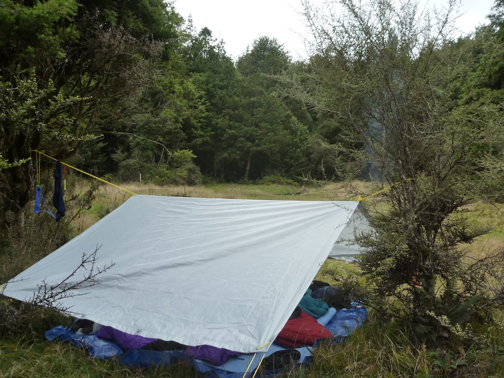 Péntek délután becuccoltunk a kocsiba és Nicknél elosztottuk a közös cipelnivalót meg némileg racionalizáltuk a holmit, aztán kb. három és fél óra autókázás után megérkeztünk az erdő tövébe, ahol a DoC táborhelyei vannak. Egyet ki is szemeltünk, ott felvertük a sátrat és megittuk az összes unikumot majd aludni tértünk. Reggel összecihelődtünk, egy félreeső helyen belőttük a puskákat, majd elkocsiztunk a 32-es út és a Waihaha folyó találkozásához, ahol van egy pici parkoló és ahonnan a Waihaha túraútvonal indul. Az ösvény 9.4km a Waihaha kunyhóig és jobbára a Waihaha folyó kanyargós vonalát (de a szintjét nem) követi. Az ösvény elején még ott sétál az ember a parton, de hamar emelkedni kezd az út és kisvártatva már madártávlatból szemlélhetjük a vizet.