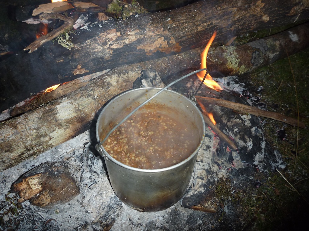 Délután visszajöttek anélkül, hogy bármit is lőttek volna, viszont kiderült, hogy a valóságból hiányzik egy patak, amit jelöl a térkép, ellenben a folyón át lehet vergődni száraz lábbal, mert kidőlt fák és mindenféle hordalékkövek hidat építettek magukból a kirándulók legnagyobb örömére. Este rehidráltuk a pörköltet, csináltam tarhonyát, kedélyesen belakmároztunk és egy kis borozgatás után végignéztük, ahogy Nick előveszi a lisztet (súrturájz) meg a dixie-t és elkezd valami elmebeteg recept alapján sütit csinálni. Eltartott egy ideig, mire kész lett, de hát időnk az volt bőven, golden sziruppal leöntve már majdnem ehető volt, de nem akartunk elvenni a kedvét, olyan lelkesen csinálta. Nem sokkal később elhúztunk aludni. Ekkor szemerkélt egy kicsit az eső, de ezt abba is hagyta elég gyorsan.