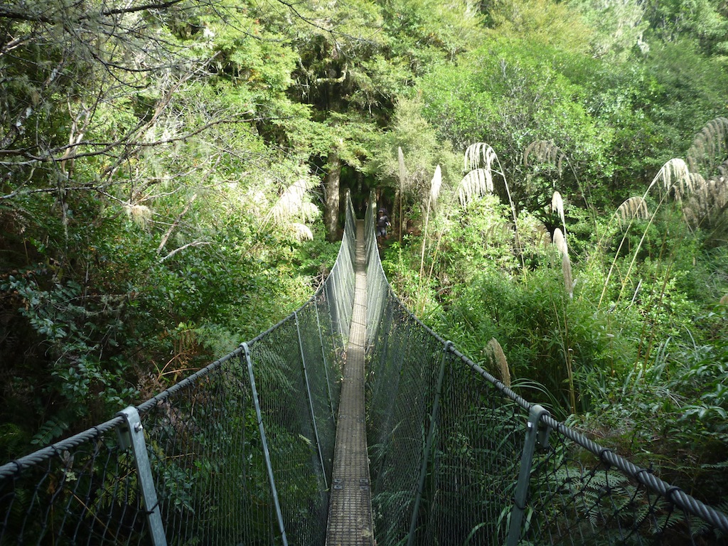 A huttól a következő hutig (+7 óra menés!) vezető ösvény már a Hauhungaroa Track nevet viseli és ezen folytattuk az utat dél felé, követve a folyót. A csapás sokat aljasodott, több ízben kellett nagy, kidőlt fákon átmászni és patakokon átkelni, ezekhez a vizekhez persze le kellett mászni, majd a túlparton felkapaszkodni, mint a pókember. Említettem már, hogy irodában dolgozom? Igazából fogalmam sincs mennyit mehettünk még, sem időben, sem távolságban nem tudtam saccolni, mivel sem órám nem volt, sem pedig nem érdekelt semmi, az utolsó fél órában már katatón állapotban baktattam, sok fogalmam nem volt a világról. Sok fogalom egyébként nem nagyon kell, egy ösvény van, ha tudsz menni, akkor azon vagy, ha nem tudsz menni, akkor letértél, lépj vissza egyet. Az út egyébként jelölve is van, fehér táblácskák vannak a fákra szögezve, ha azokat követi az ember, akkor nem tévedhet el.